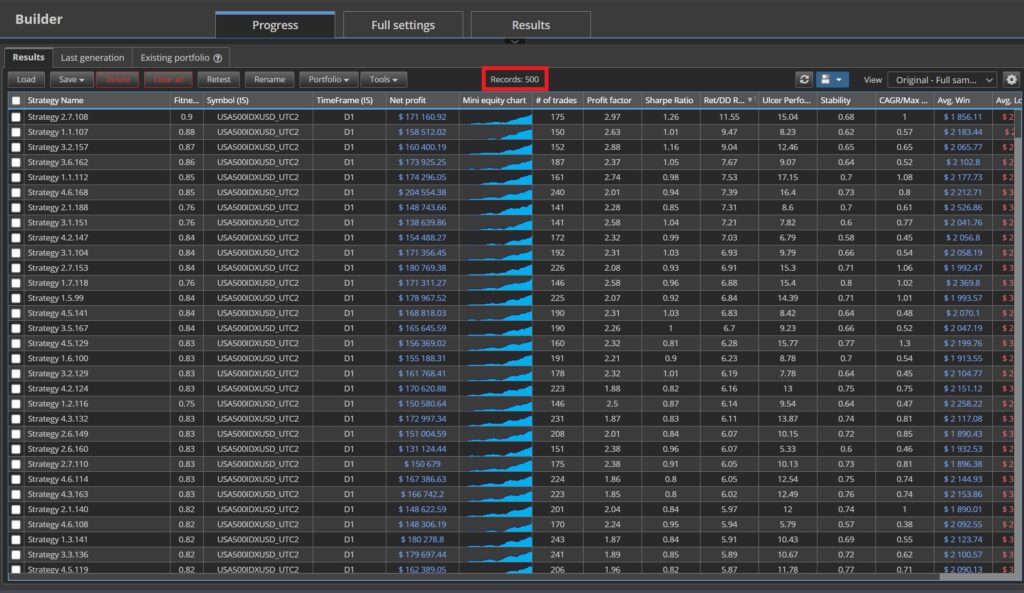 シミュレーションを実施するとあっという間にフィルターを追加した500もの戦略を提案してくれました。リターンドローダウンレシオ順に並べ替えて確認すると、最も上位の戦略ではプロフィットファクターが2.97、リターンドローダウンレシオは11.55と驚異的な数値となっています。