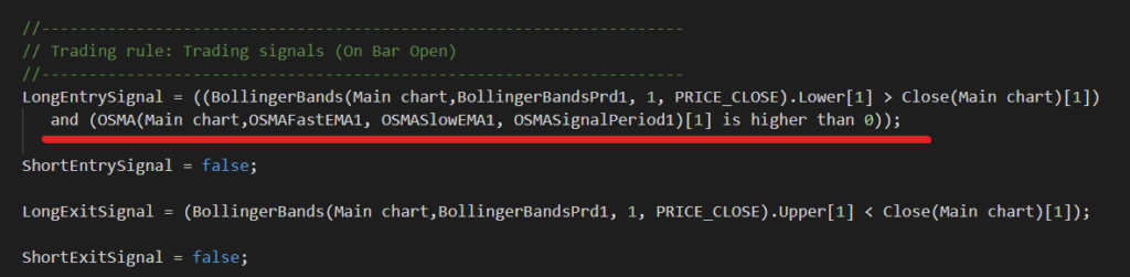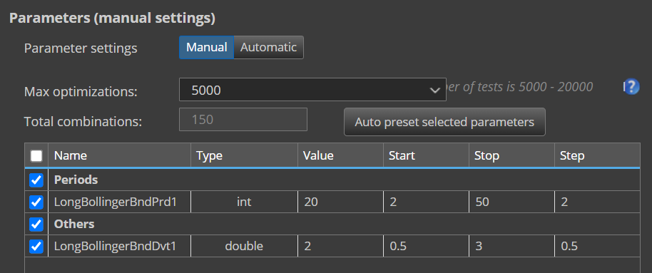 以下の設定でボリンジャーバンド戦略のシミュレーションを実施しています。