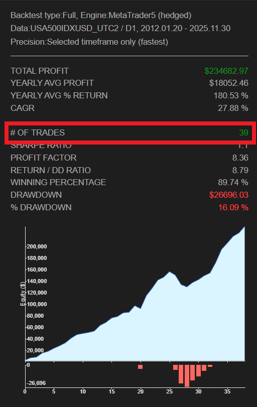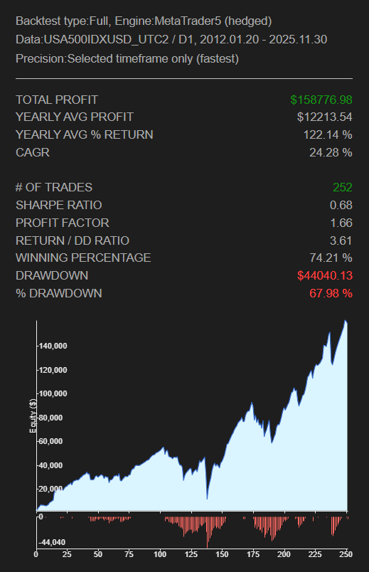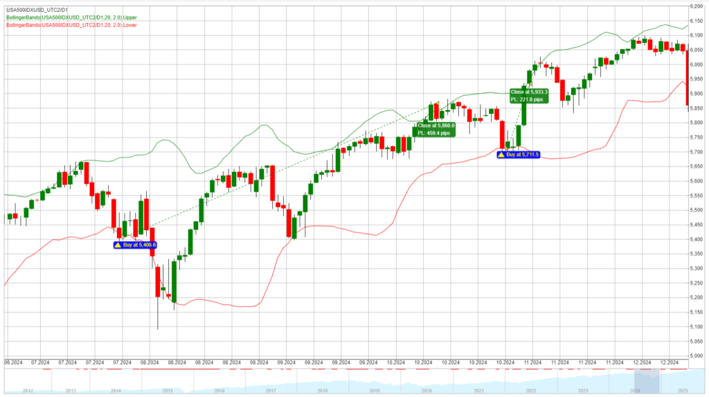 このように、S&P500は「一時的な下落からの回復」を狙う戦略と非常に相性が良く、ボリンジャーバンドの−2σを下回った局面では、統計的な反発期待とマーケット構造の両方が戦略を後押しする形になります。