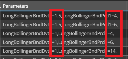 最適化を実行し、リターンドローダウンレシオの高い順に並べ替えを行いました。そして、上位の戦略のパラメータ値を確認すると、ボリンジャーバンドの期間は4または6、標準偏差は1.5か1あたりが良さそうだということが分かります。