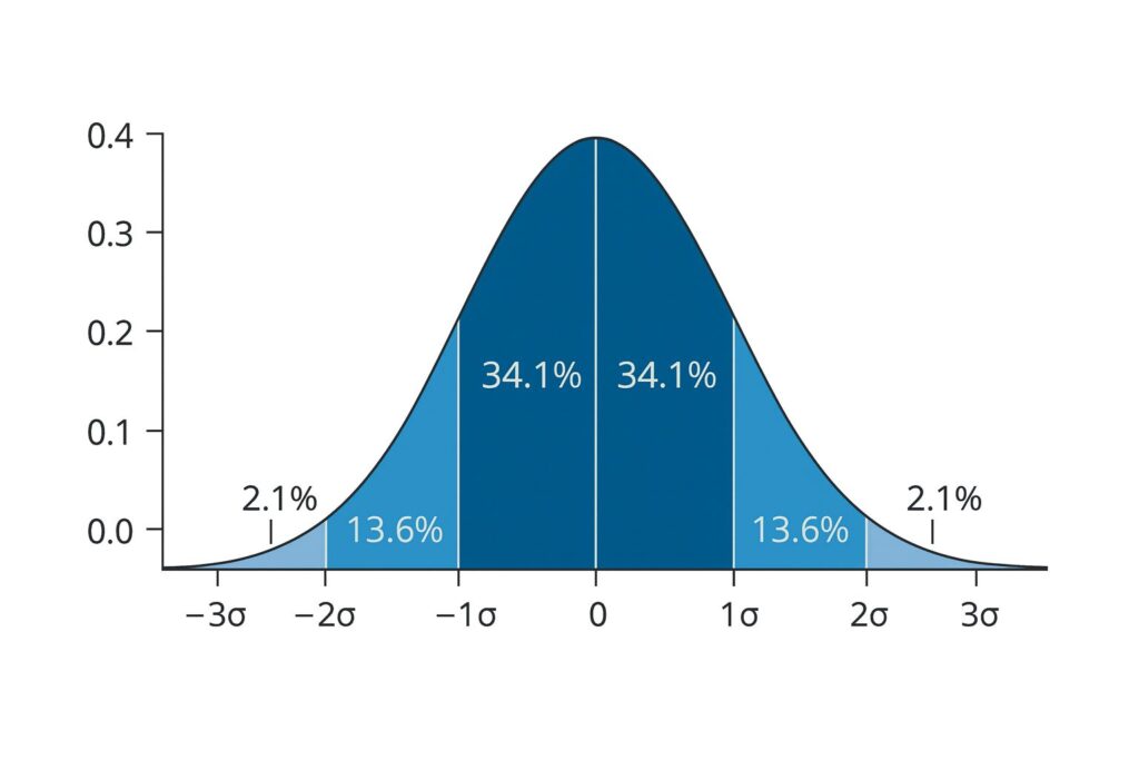 この考え方は、統計学でよく使われる正規分布のイメージに非常に近く、次の図のように、価格がどのバンド内に収まるかの確率を直感的に理解することができます。