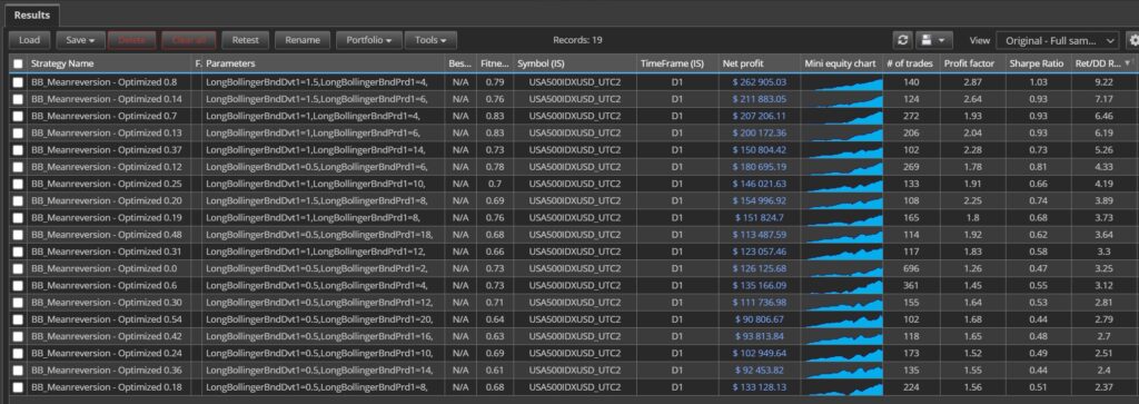 現在の戦略はボリンジャーバンドのみをエントリー及び決済条件とした非常にシンプルな戦略ですが、ここにフィルターを加えることによって、さらに戦略の精度が向上するか確認します。インジケータはたくさんありますが、StrategyQuantXを使うとAIが最も適したフィルターを提案してくれます。