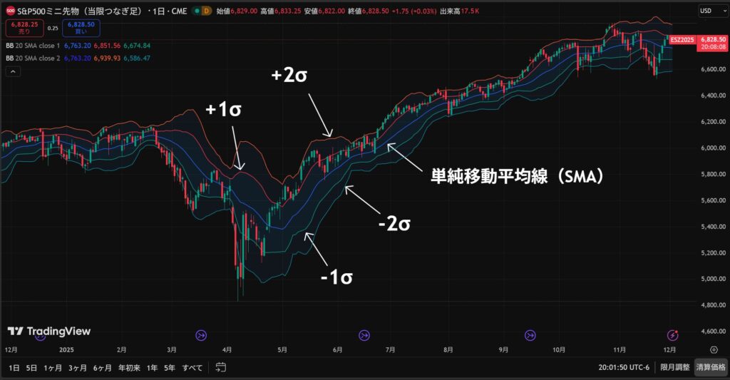 この計算式だけを見ると少し複雑に感じるかもしれませんが、要するに「指定した期間の終値が、どの程度ばらついているか」を統計的に整理し、そのばらつきの範囲に価格が収まる確率を分布として可視化しているだけです。中心となる移動平均線を基準に、±1σ、±2σ、±3σといったバンドを描くことで、「この範囲に価格が収まる可能性はどれくらいか?」を視覚的に判断できるようになります。