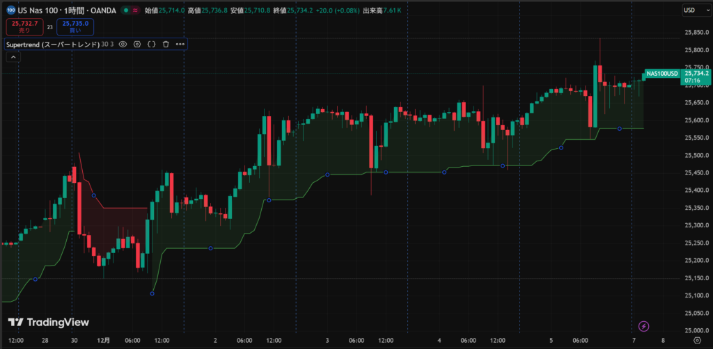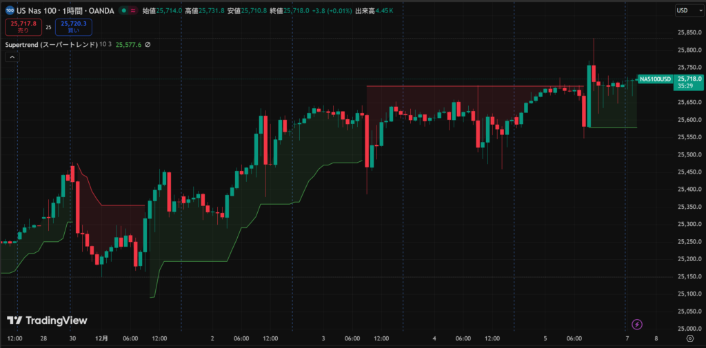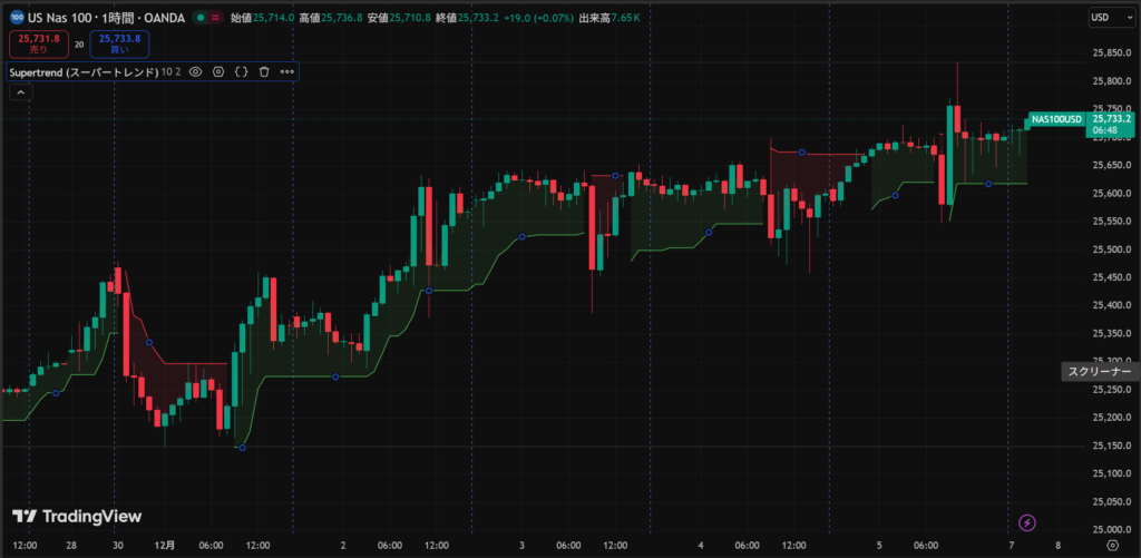 そこで、今回は、Nasdaqの1時間足データを対象としたSuperTrendインジケータを使ったブレイクアウト戦略を紹介します。トレンドが発生しやすいNasdaq市場において、過去のデータから「トレンドの発生と継続」を捉えることは有効なアプローチとなります。