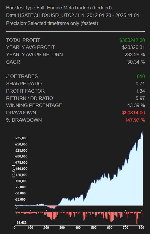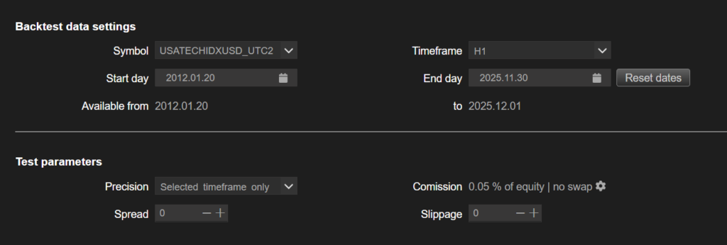 今回の戦略例では、Nasdaqを対象銘柄として採用しています。ご存じの方も多いように、Nasdaqは長期的に強い上昇傾向を持つ市場であり、構造的に「買い方向」に優位性があります。そのため今回の戦略では、買いエントリーのみを対象としています。これにより、マーケットの持つ上昇バイアスと戦略の方向性が一致し、より堅実な結果を期待できます。