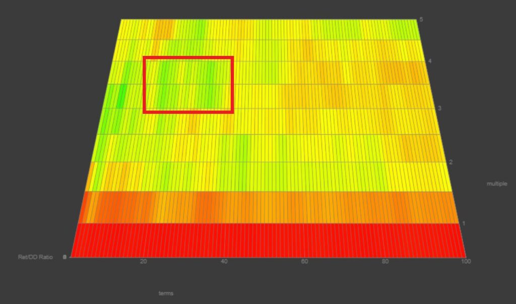 リターンドローダウンレシオが最も高かったのは「期間7・乗数3」でしたが、今回はより広範囲で安定性が確認できた期間30付近(画像赤枠あたり)を重視し、最終的に期間33・乗数3.5を採用しました。