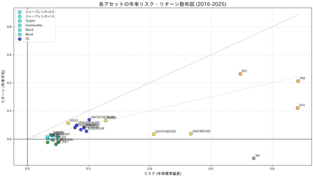 先ほどの原油、天然ガス、ETH、TRXはいずれも「0.5のライン」を下回っています。しかし、BTC(ビットコイン)だけはこのラインの間に位置しています。つまり、これらハイリスク銘柄の中で、最も投資効率が良く「勝ちやすい」のはBTCであるということが分かります。