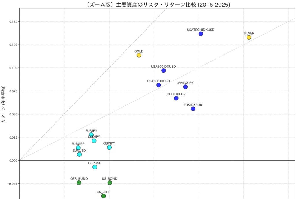 例えば、中央付近にある(左)原油と(右)天然ガスに注目してください。 この2つはリターンがほぼ同じですが、天然ガスのほうが右側(リスク大)に位置しています。つまり、同じ利益を狙うにしても、天然ガスのほうが「激しい揺さぶりに耐える必要がある」ということです。この記事の定義で言えば、より「勝ちやすい」のは原油の方だと言えます。