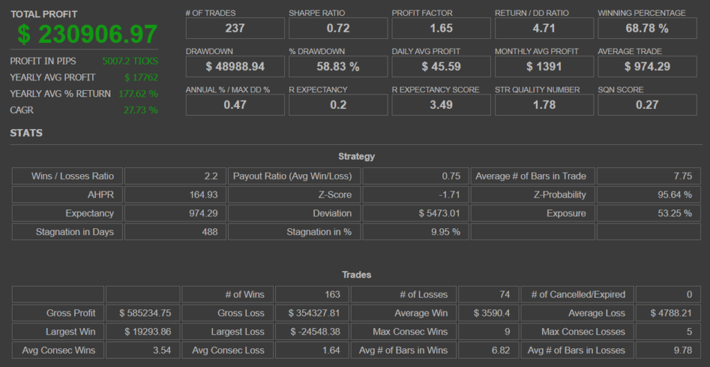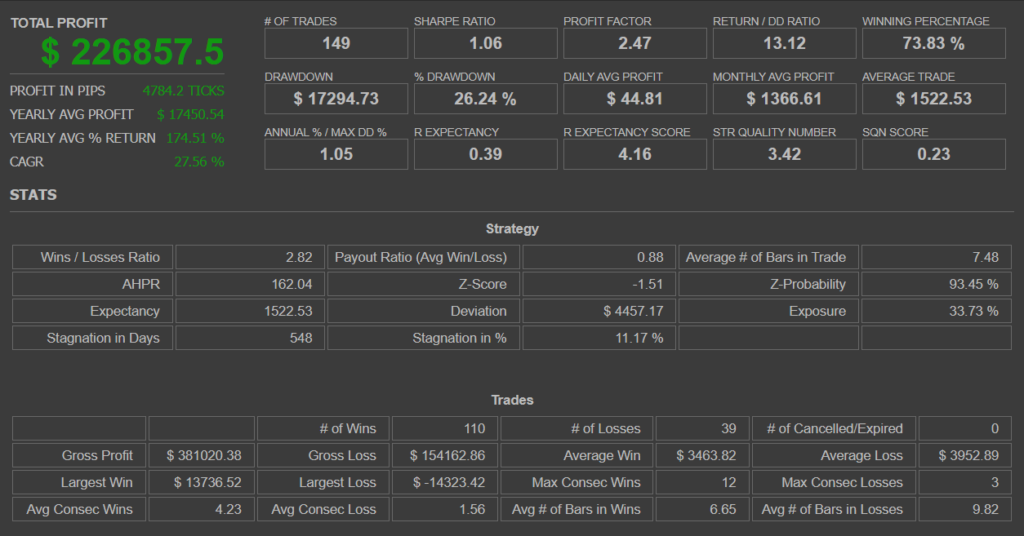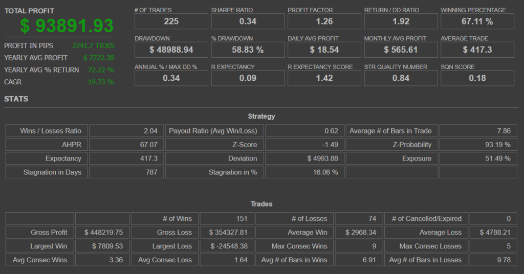結果を見ると、プロフィットファクターは1.97に上昇、リターンドローダウンレシオは4.36、勝率は66.39%と、ベース戦略のパフォーマンスに近い数値を維持していることが確認できました。