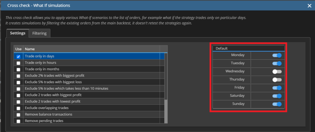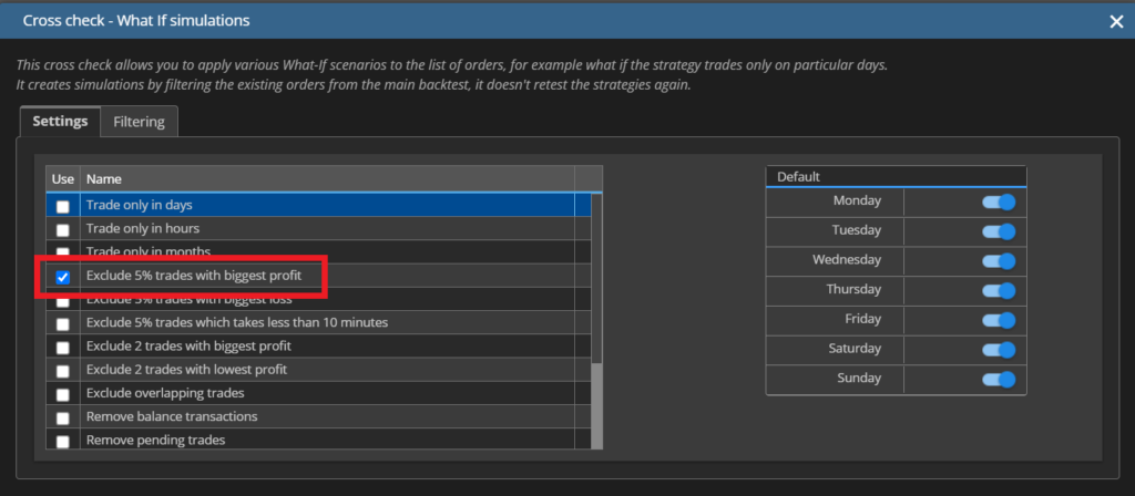 ここからは、実際にいくつかのシナリオを設定し、戦略の堅牢性を確認していきます。What if テストは単に数値を変化させるだけではなく、戦略が特定の条件に依存していないかを見極めるための重要な検証です。曜日を制御した場合や、大きな利益をもたらした取引を削除した場合、あるいは取引回数を制限した場合など、さまざまな角度から戦略を揺さぶることで「本当に安定しているのか」を確認できます。