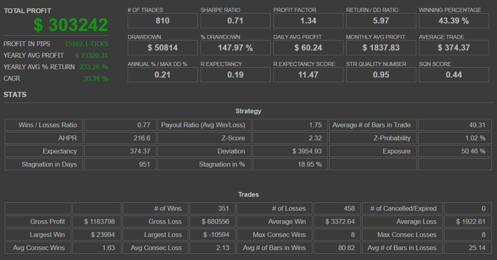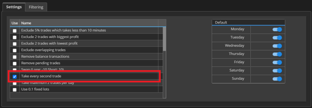 最後の検証では、取引履歴を1つずつ飛ばした場合のパフォーマンスを確認しました。結果的に取引数は半分になります。このテストのポイントは、ベース戦略のパフォーマンスと主要指標が大きく変わらないかどうかです。