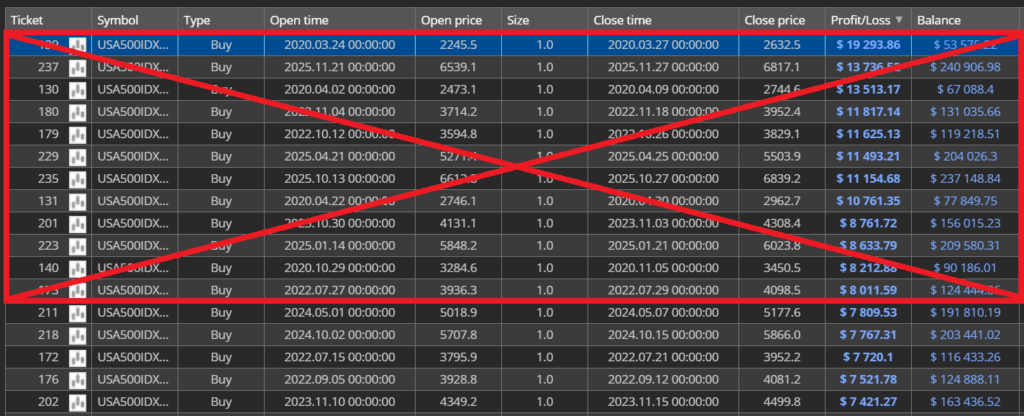 特に、世の中にはこのような方法で異常に良いバックテスト結果を作り出し、それを販売しているケースも存在します。悪い取引だけを排除するテストには意味がなく、むしろ将来の運用リスクを高めるため、十分に注意する必要があります。